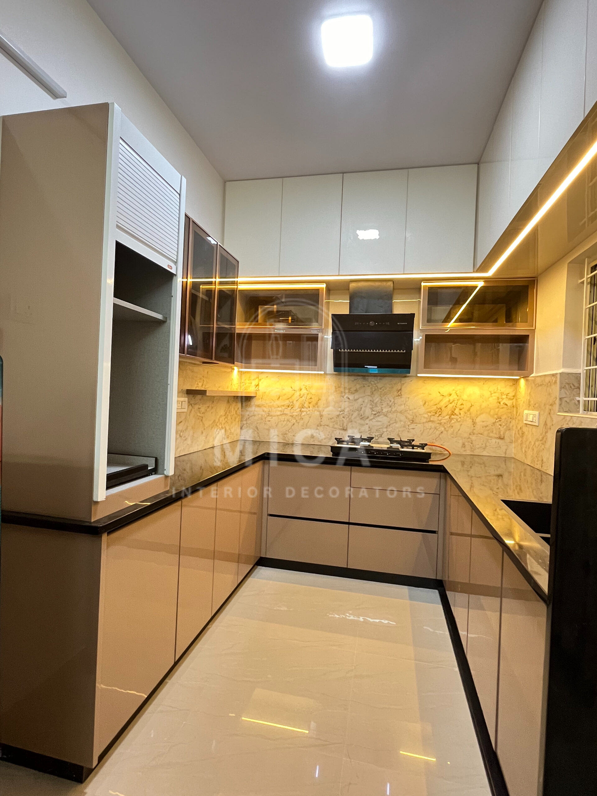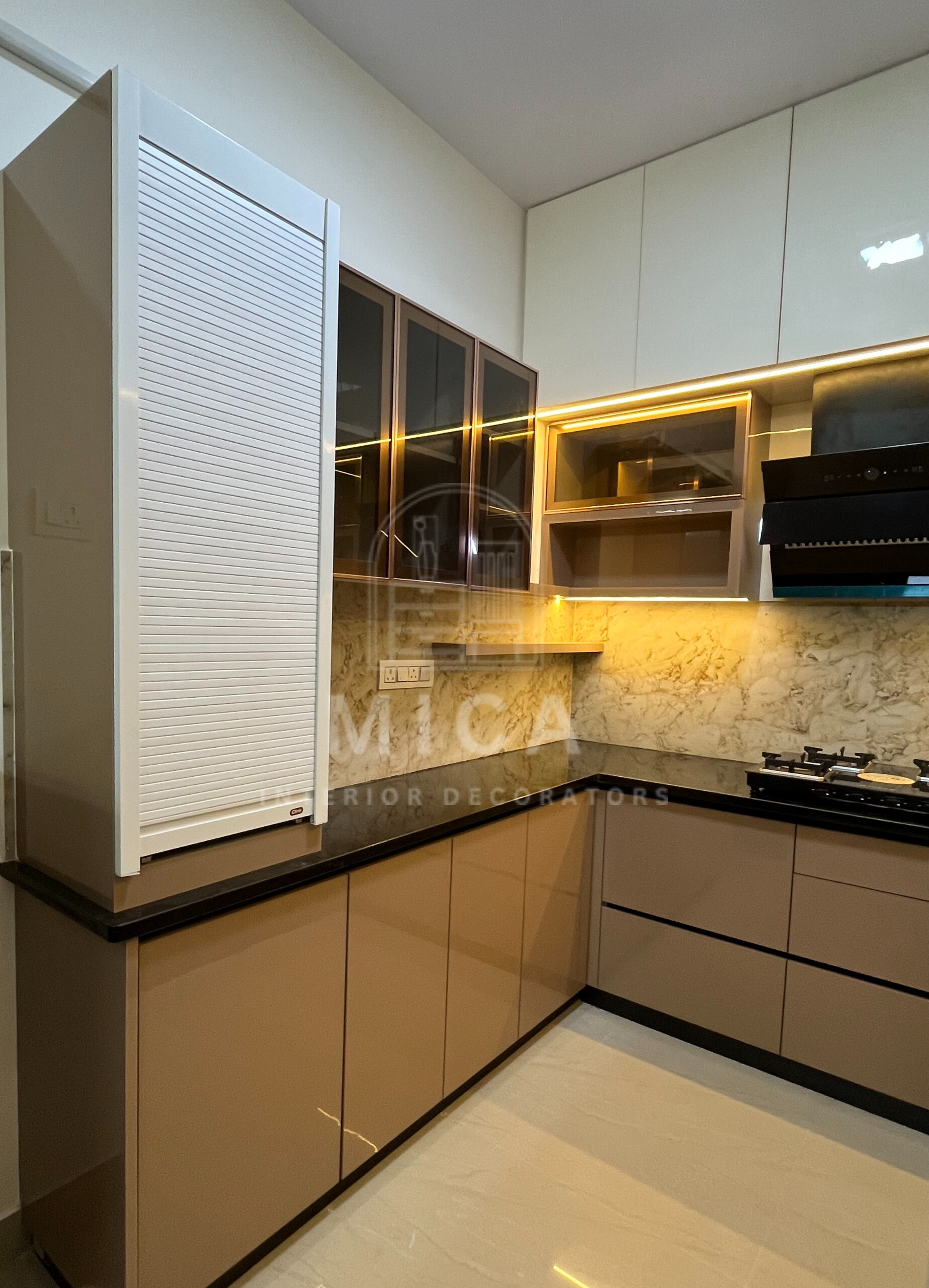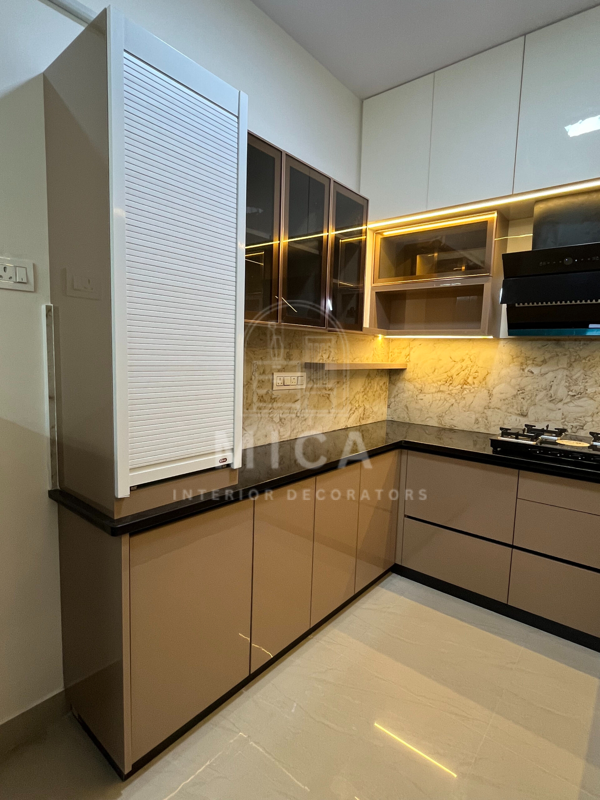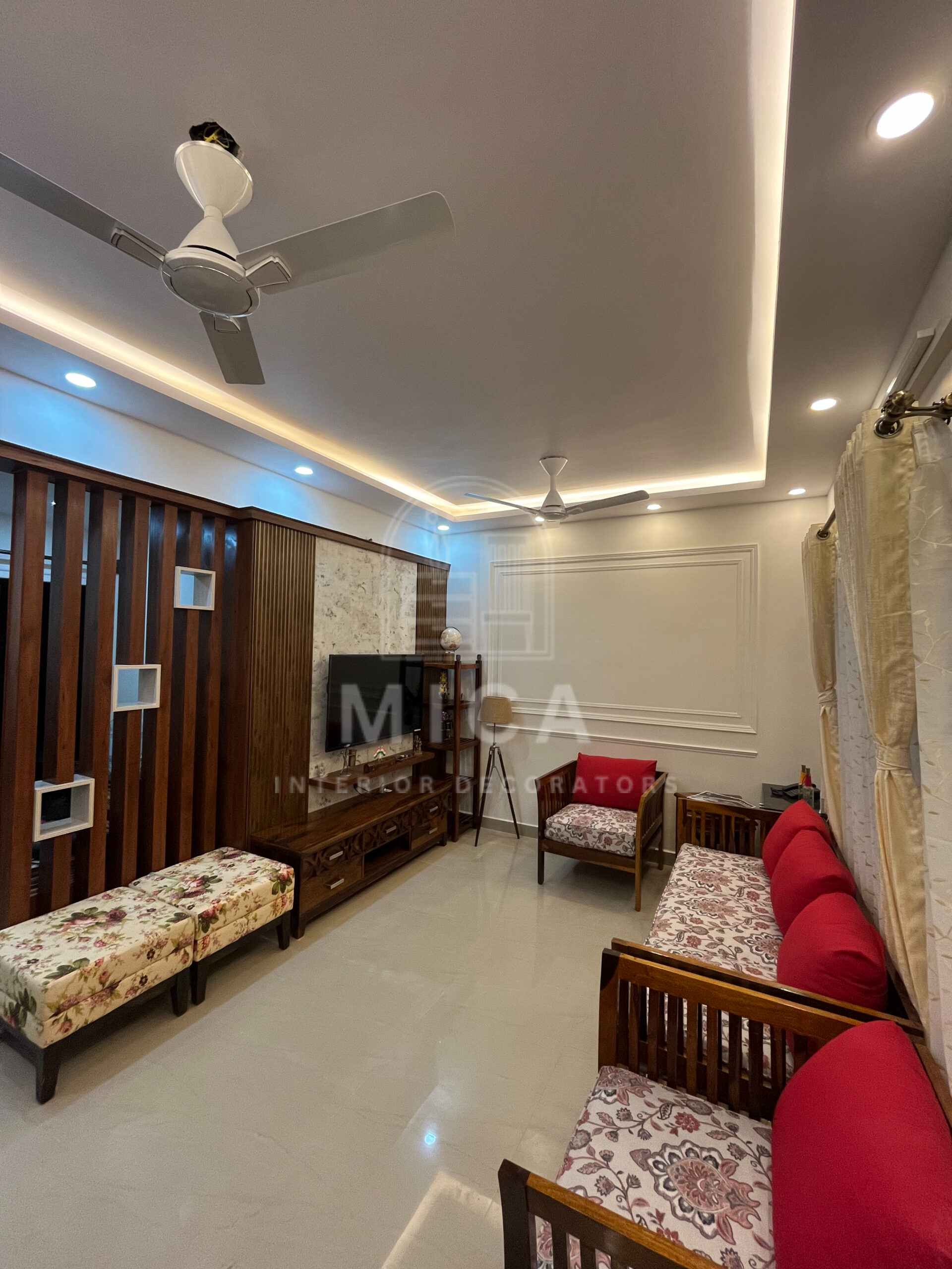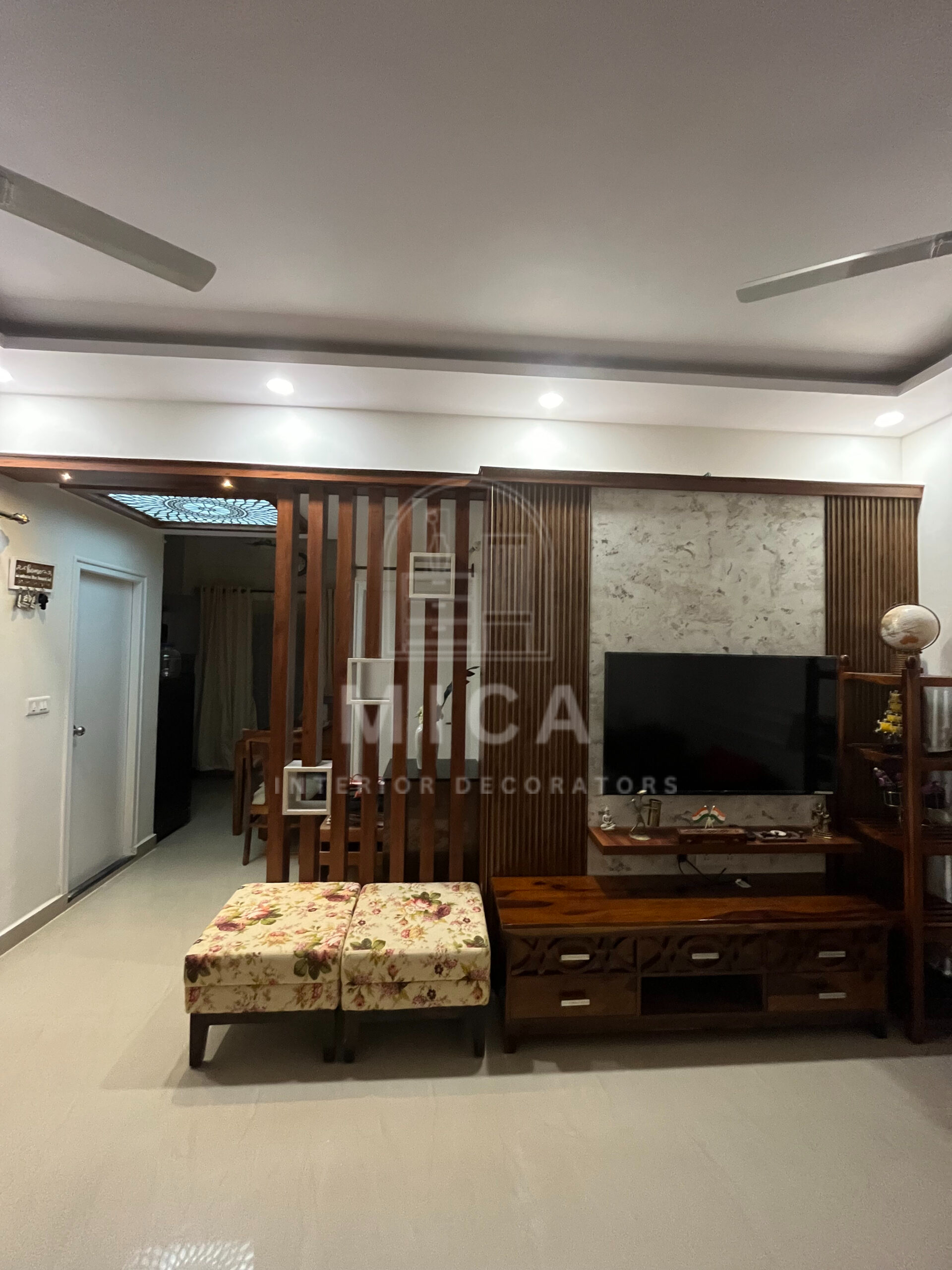 This interior design project by Mica Interiors showcases a harmonious blend of contemporary aesthetics and functional elegance. The living area features a warm wooden partition with geometric shelving, complementing the floral seating and traditional wooden furniture. The TV unit integrates wood and marble textures, adding a refined yet cozy ambiance. The modular kitchen embraces a sleek, modern design with a neutral palette, soft under-cabinet lighting, and glossy finishes for a spacious feel. The false ceiling and LED strip lighting enhance the depth and sophistication of the space. This project exemplifies a well-balanced fusion of modern minimalism and classic warmth. cohesive living space.