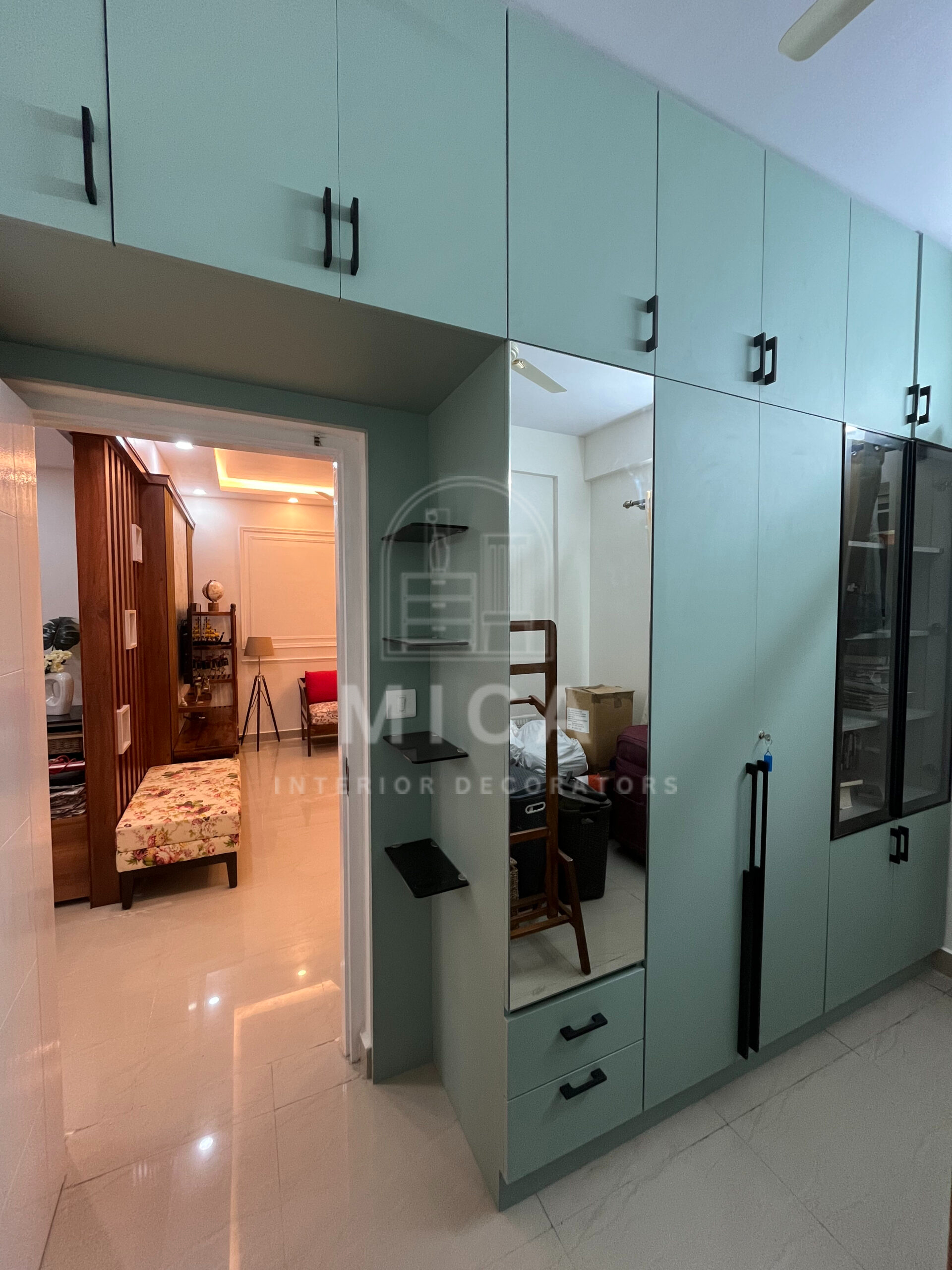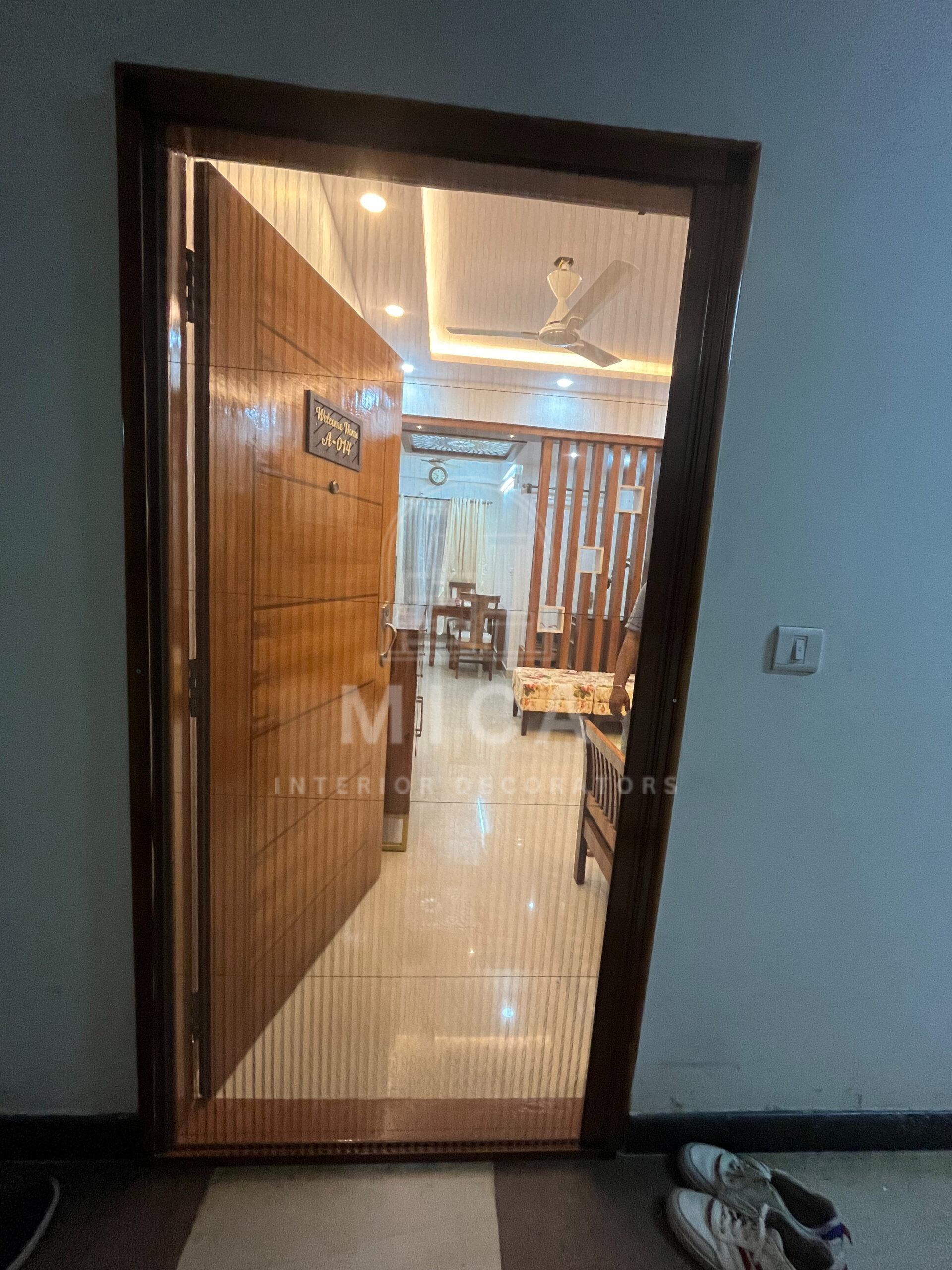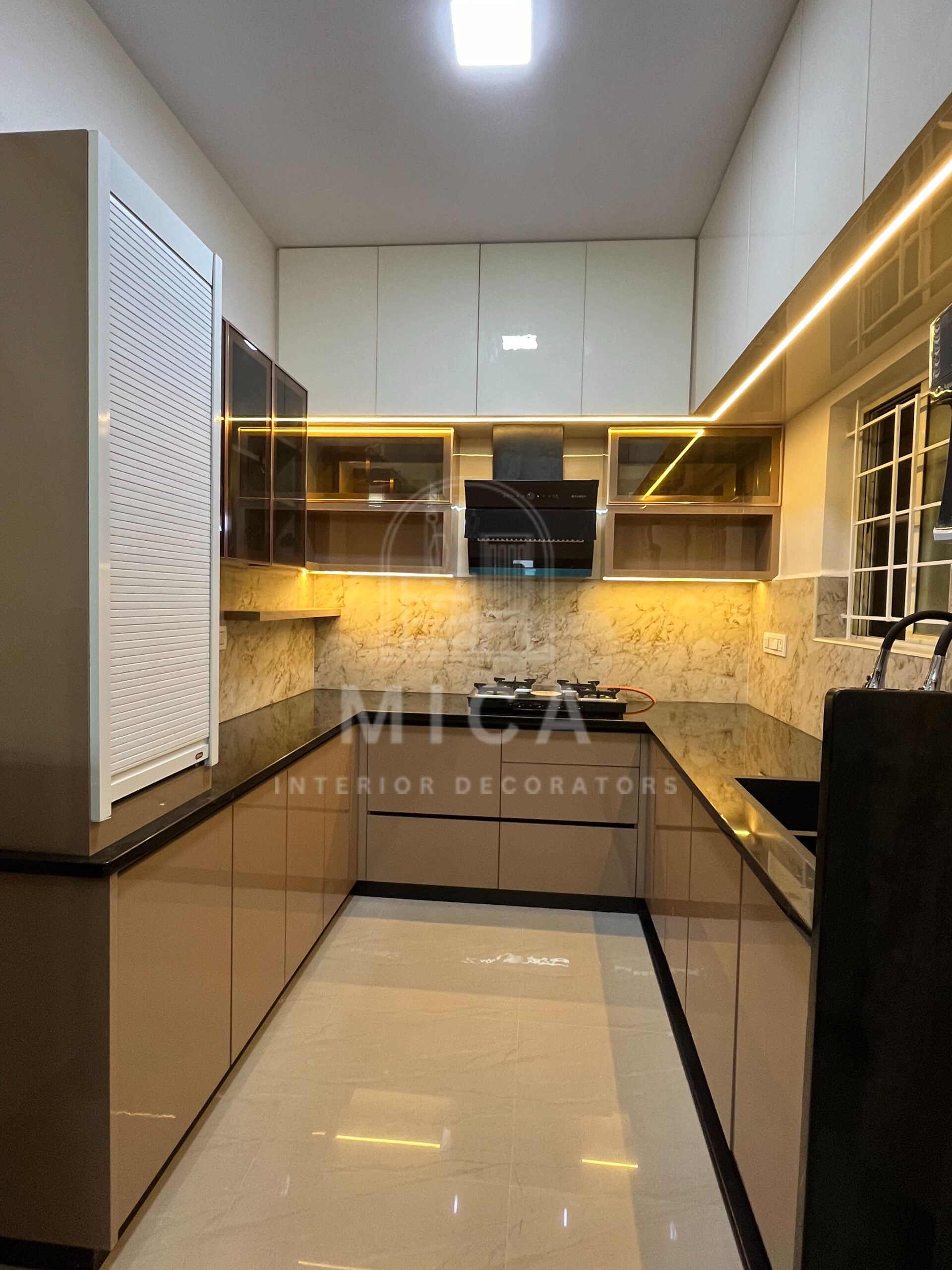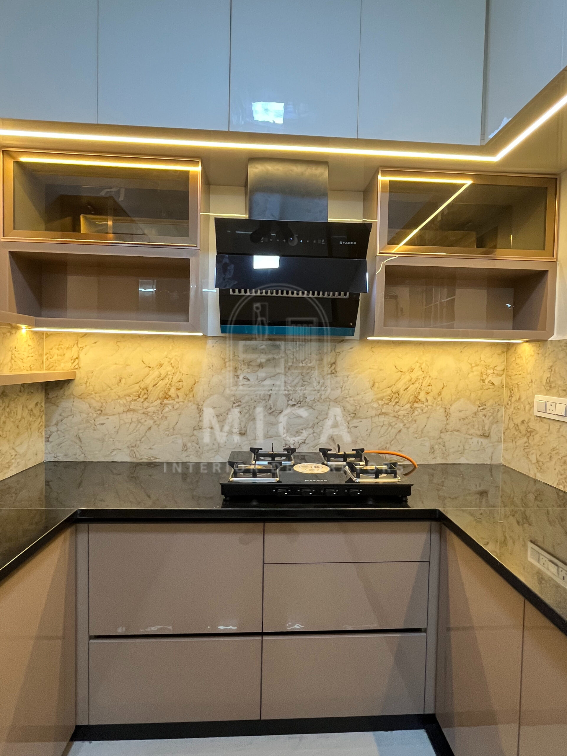 This interior design project by Mica Interiors showcases a harmonious blend of contemporary aesthetics and functional elegance. The living area features a warm wooden partition with geometric shelving, complementing the floral seating and traditional wooden furniture. The TV unit integrates wood and marble textures, adding a refined yet cozy ambiance. The modular kitchen embraces a sleek, modern design with a neutral palette, soft under-cabinet lighting, and glossy finishes for a spacious feel. The false ceiling and LED strip lighting enhance the depth and sophistication of the space. This project exemplifies a well-balanced fusion of modern minimalism and classic warmth. cohesive living space.