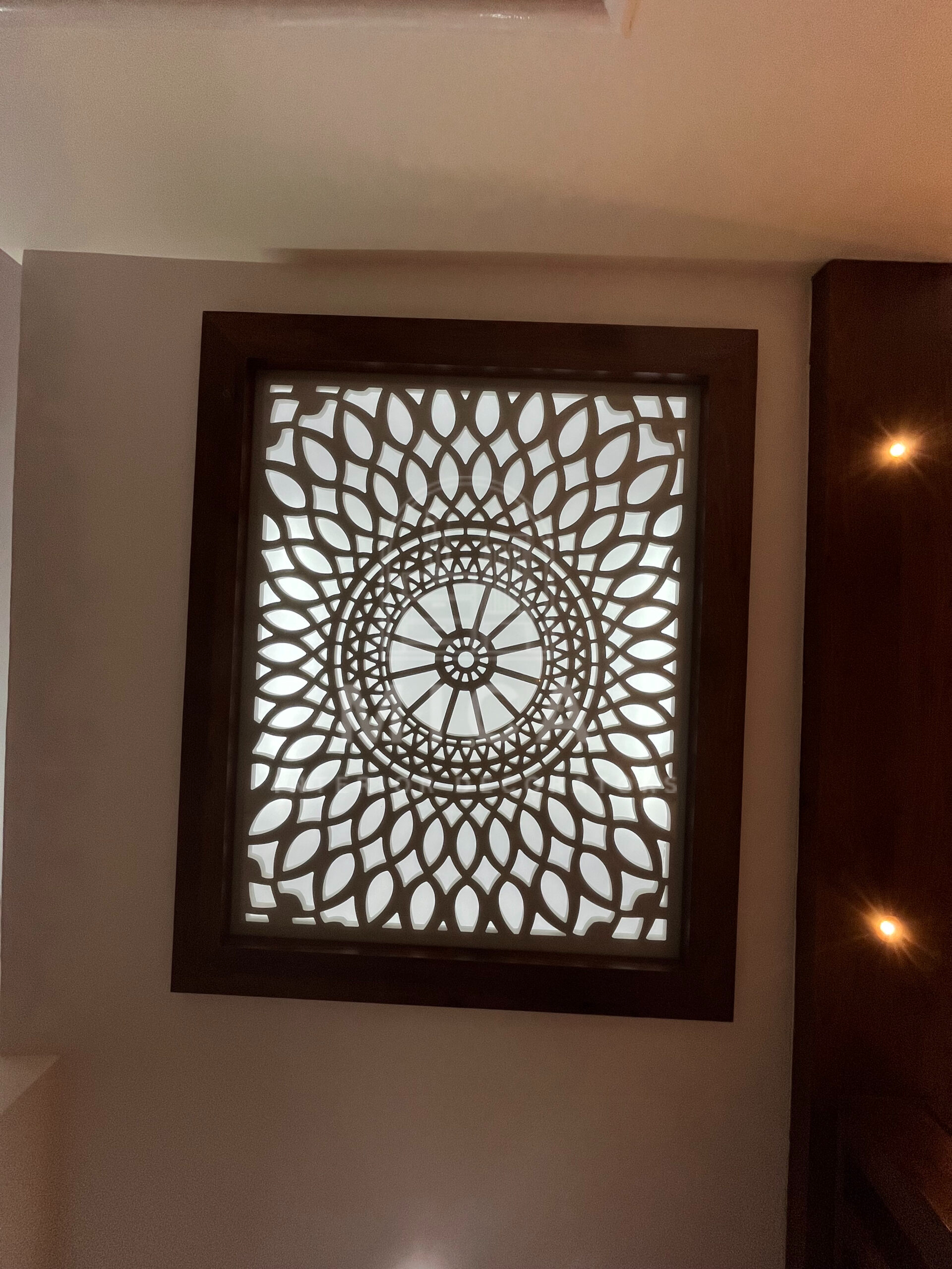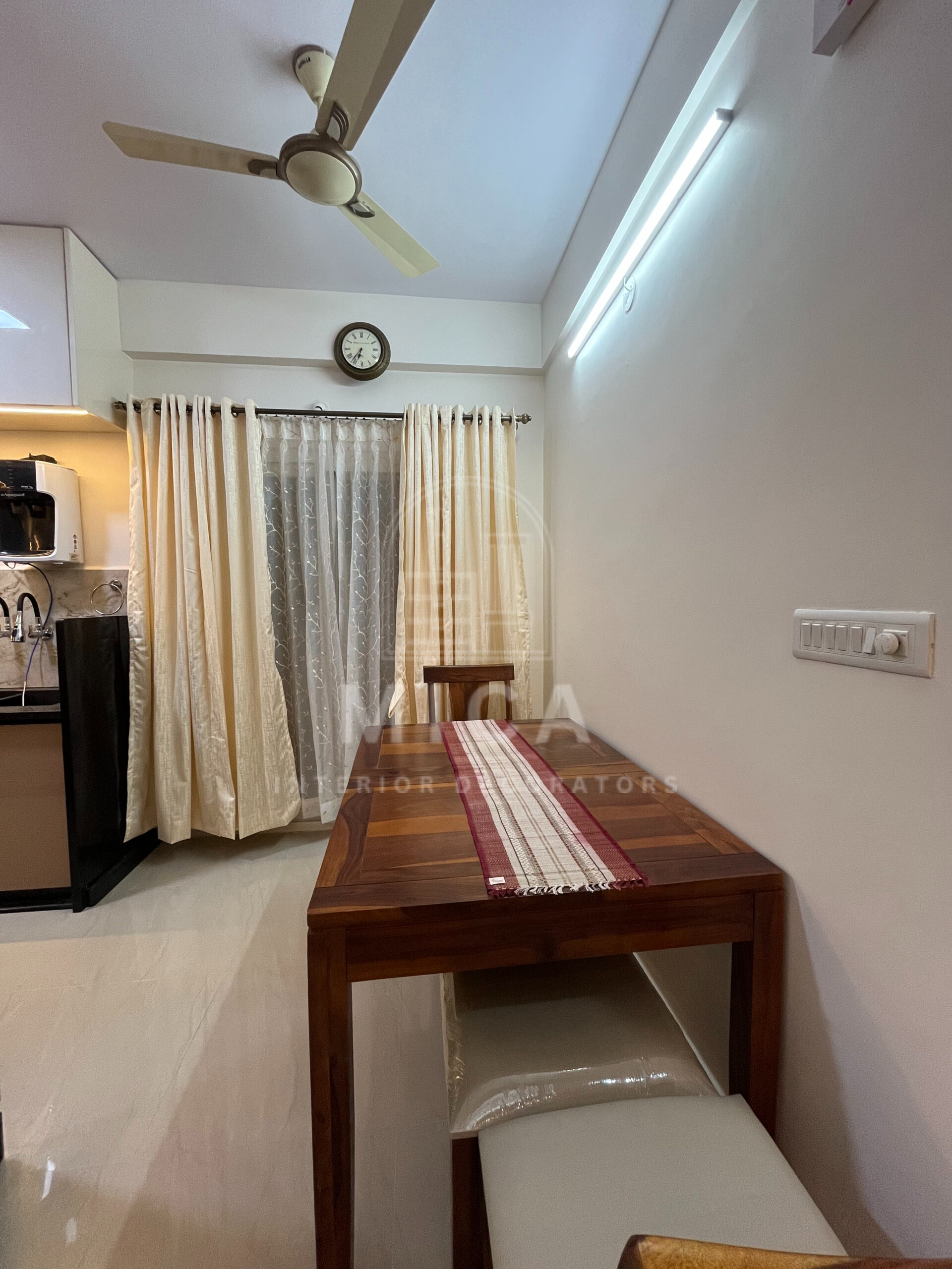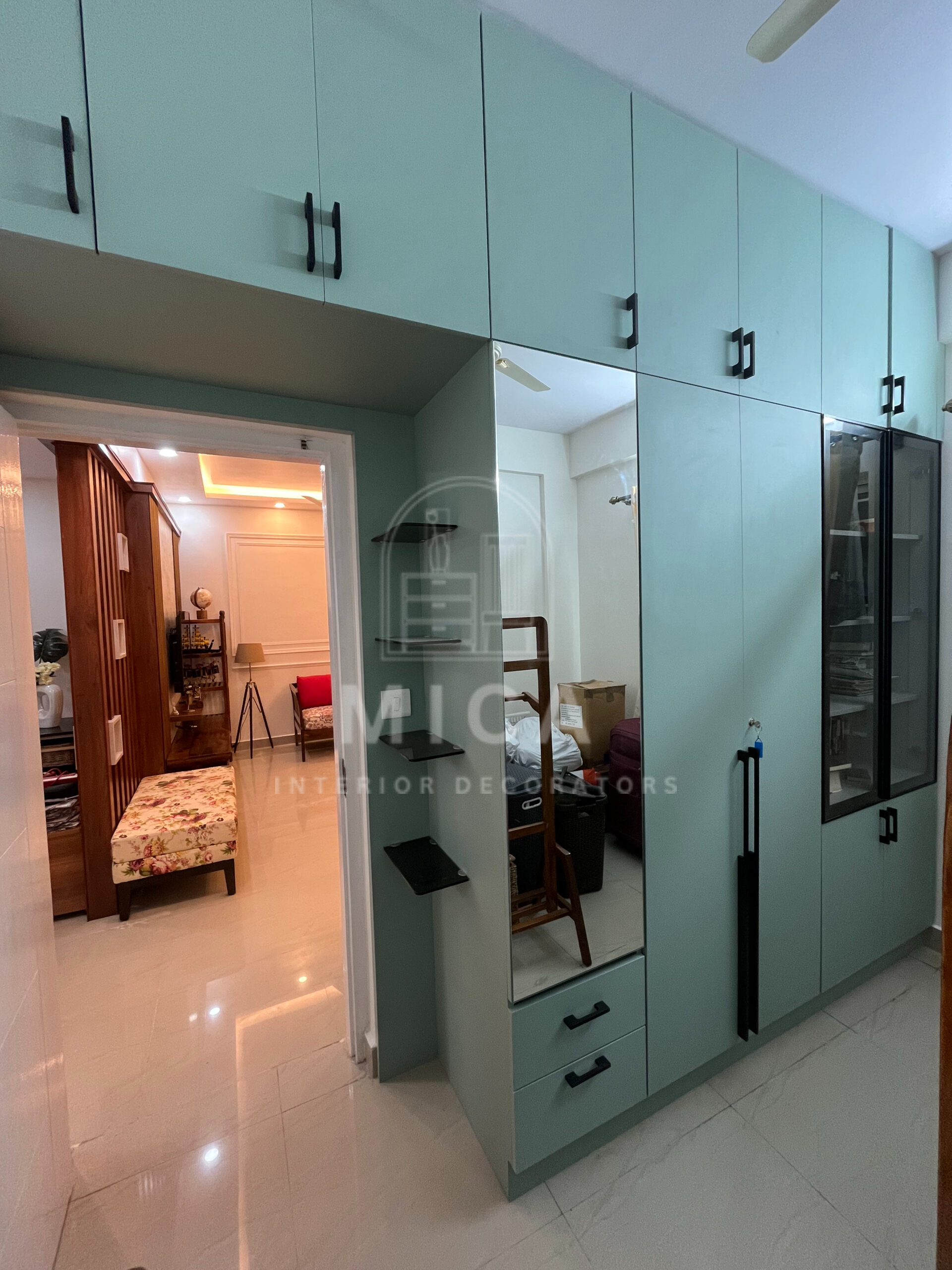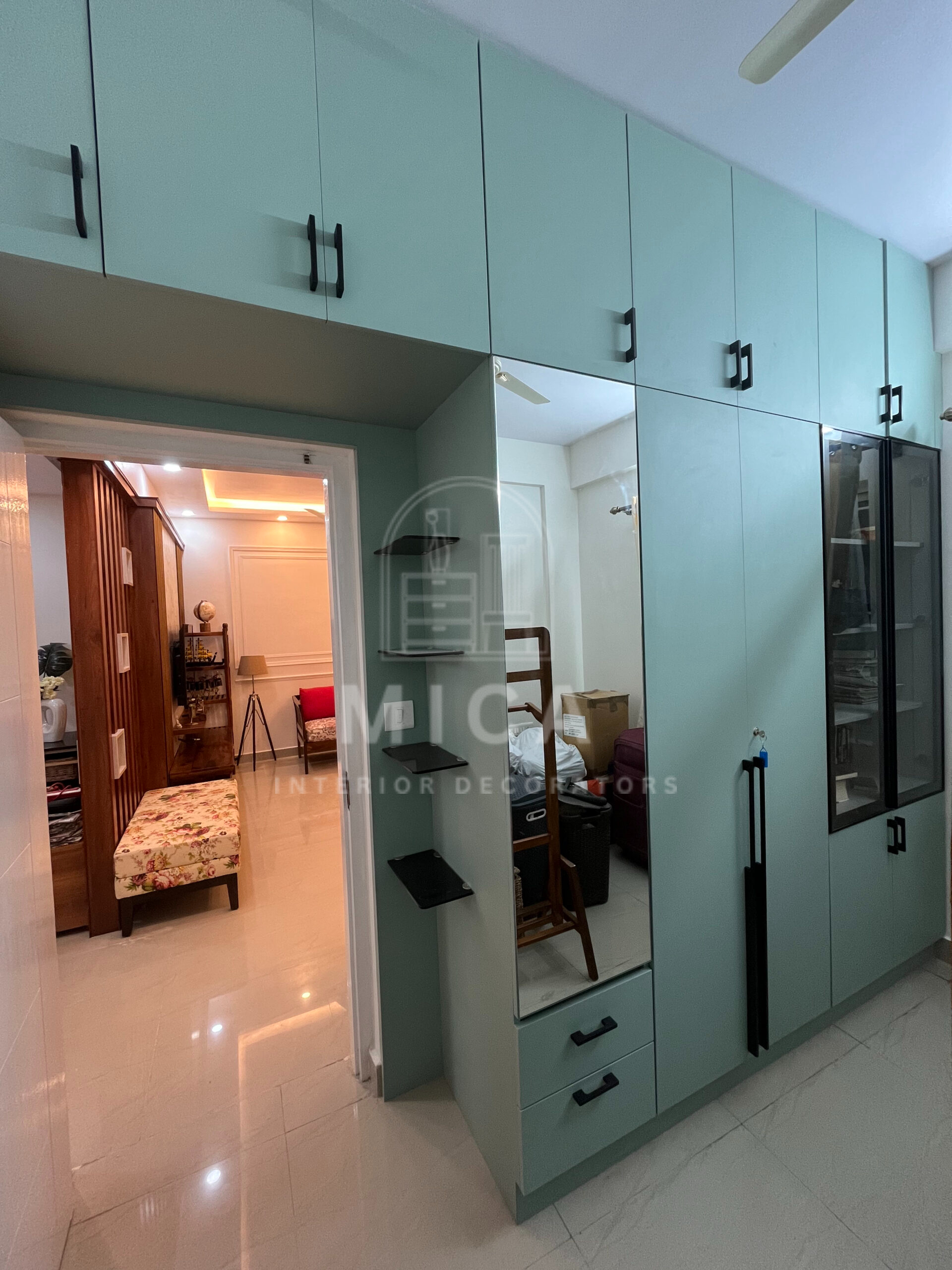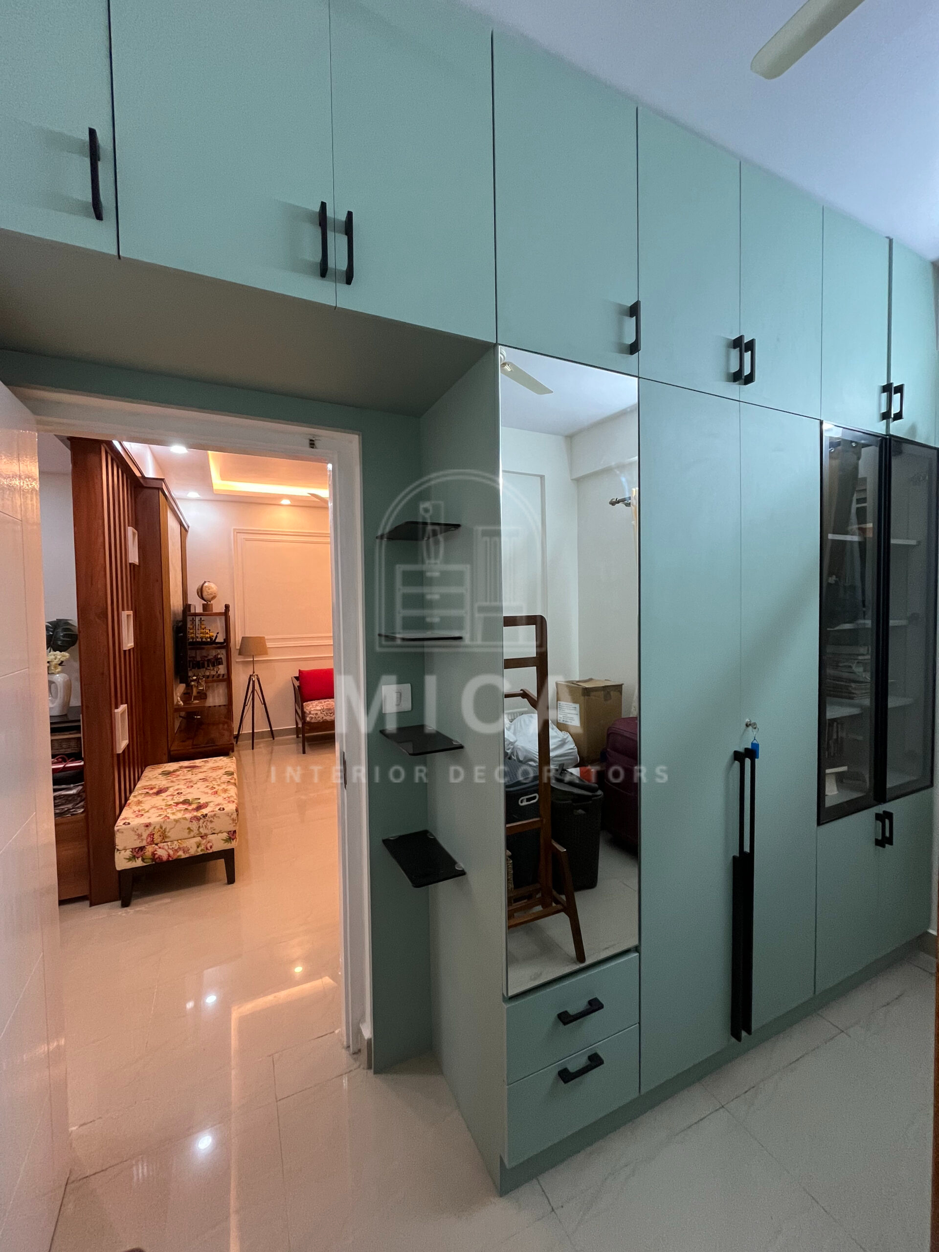 This interior design project by Mica Interiors showcases a harmonious blend of contemporary aesthetics and functional elegance. The living area features a warm wooden partition with geometric shelving, complementing the floral seating and traditional wooden furniture. The TV unit integrates wood and marble textures, adding a refined yet cozy ambiance. The modular kitchen embraces a sleek, modern design with a neutral palette, soft under-cabinet lighting, and glossy finishes for a spacious feel. The false ceiling and LED strip lighting enhance the depth and sophistication of the space. This project exemplifies a well-balanced fusion of modern minimalism and classic warmth. cohesive living space.