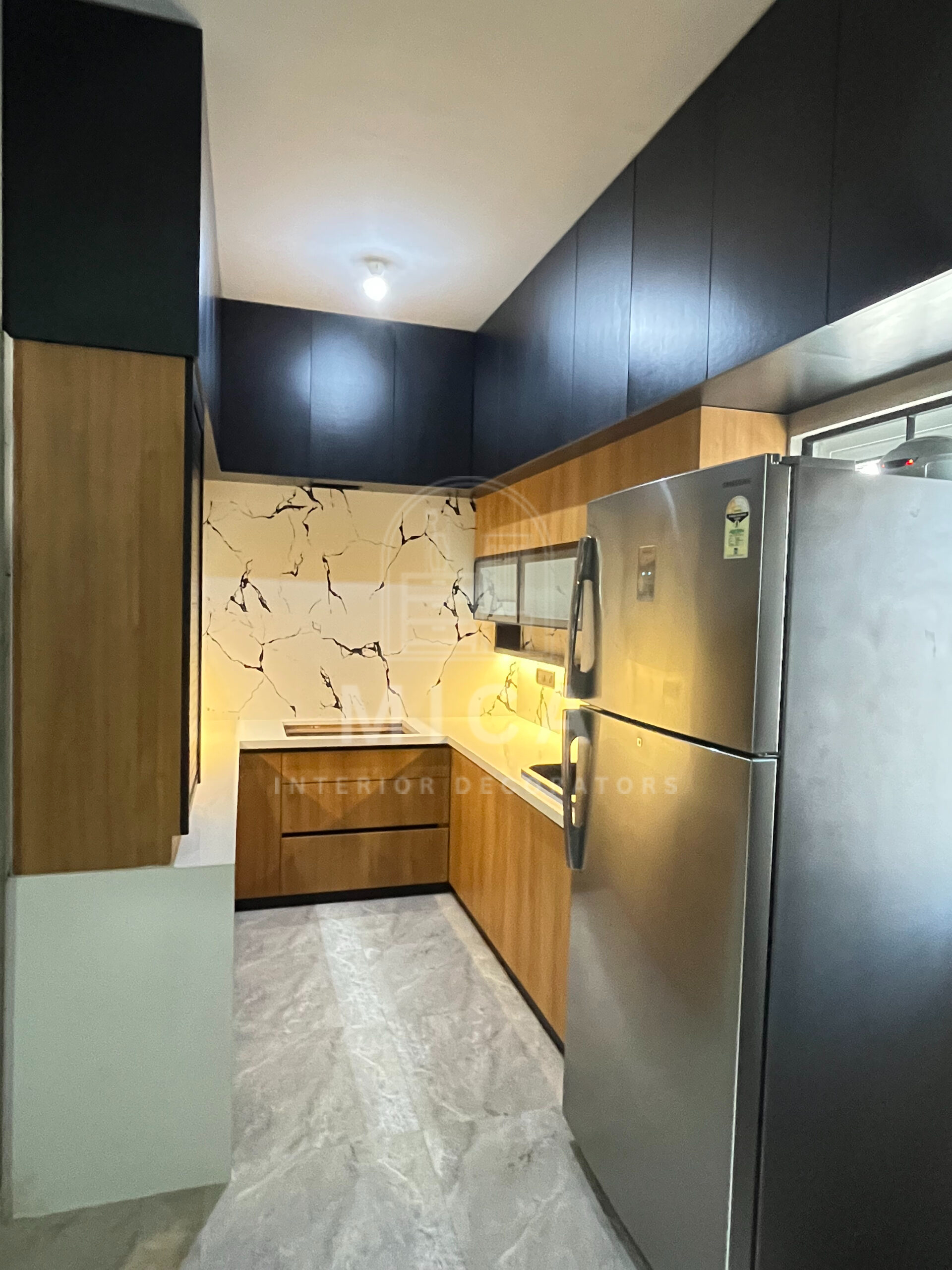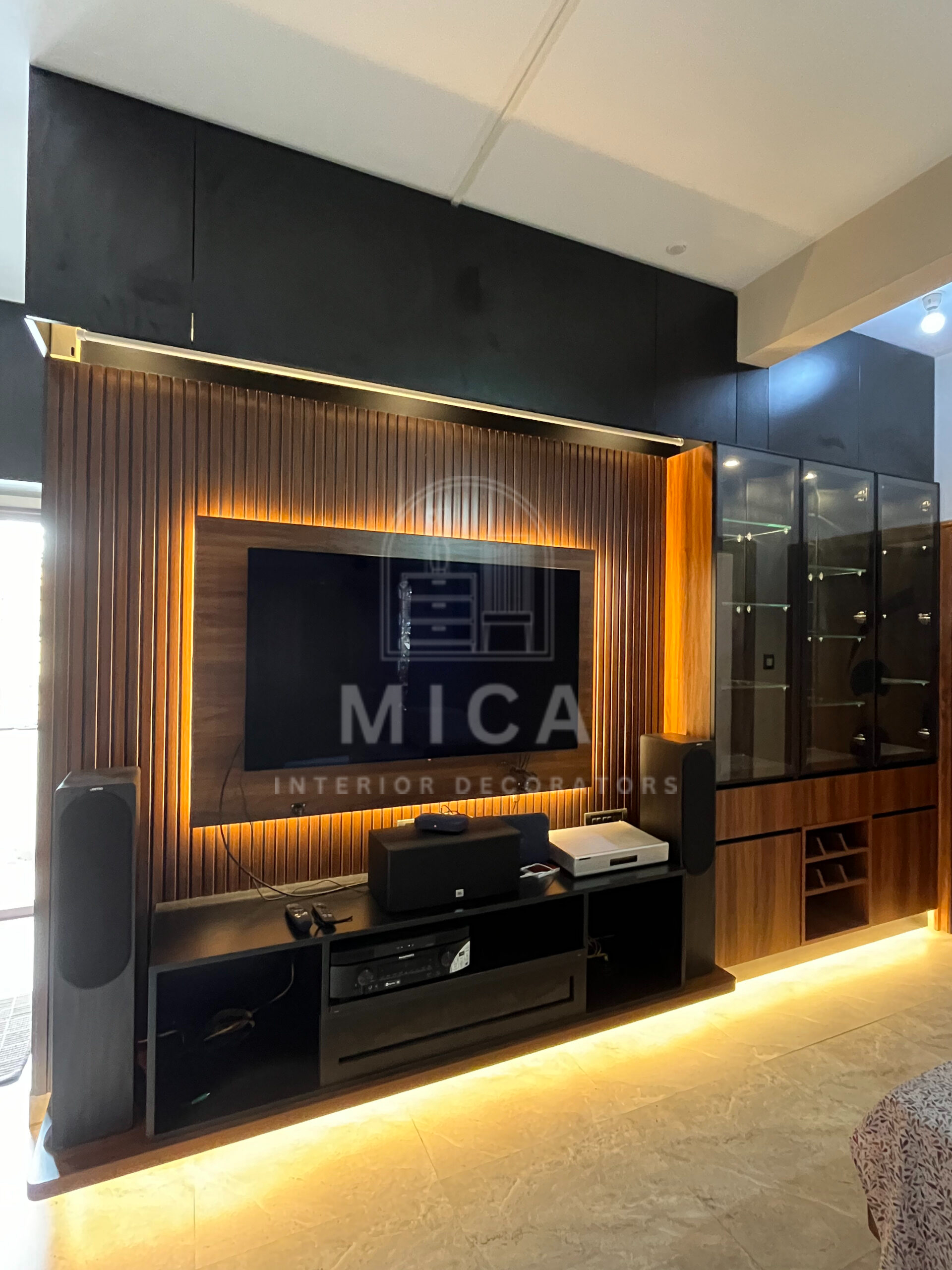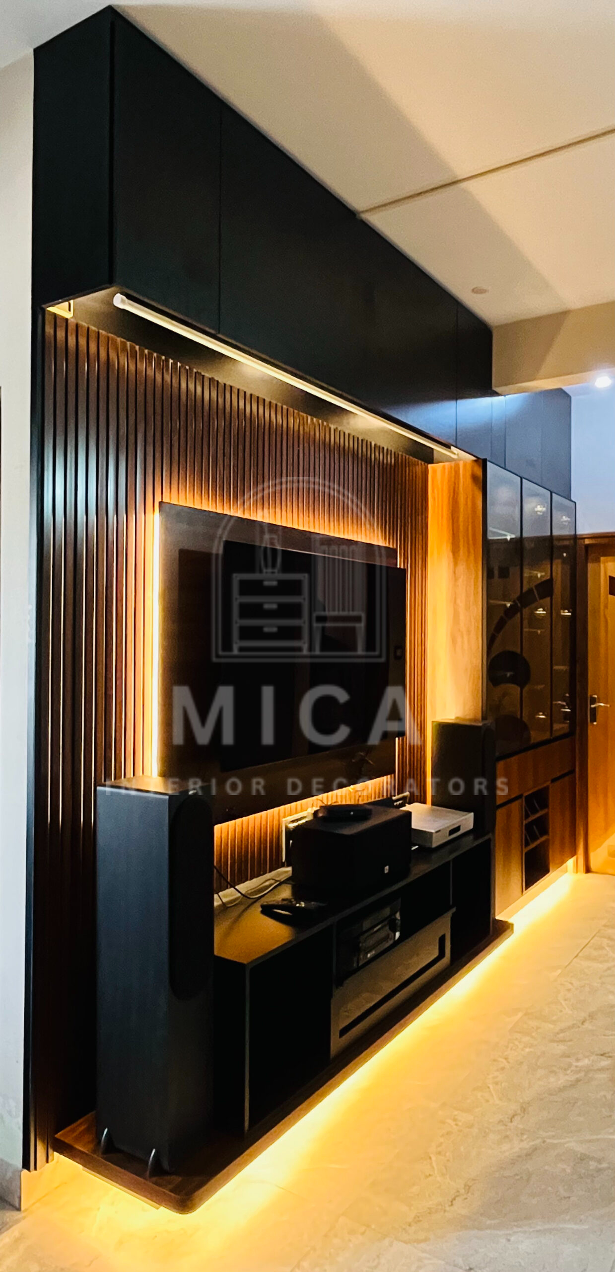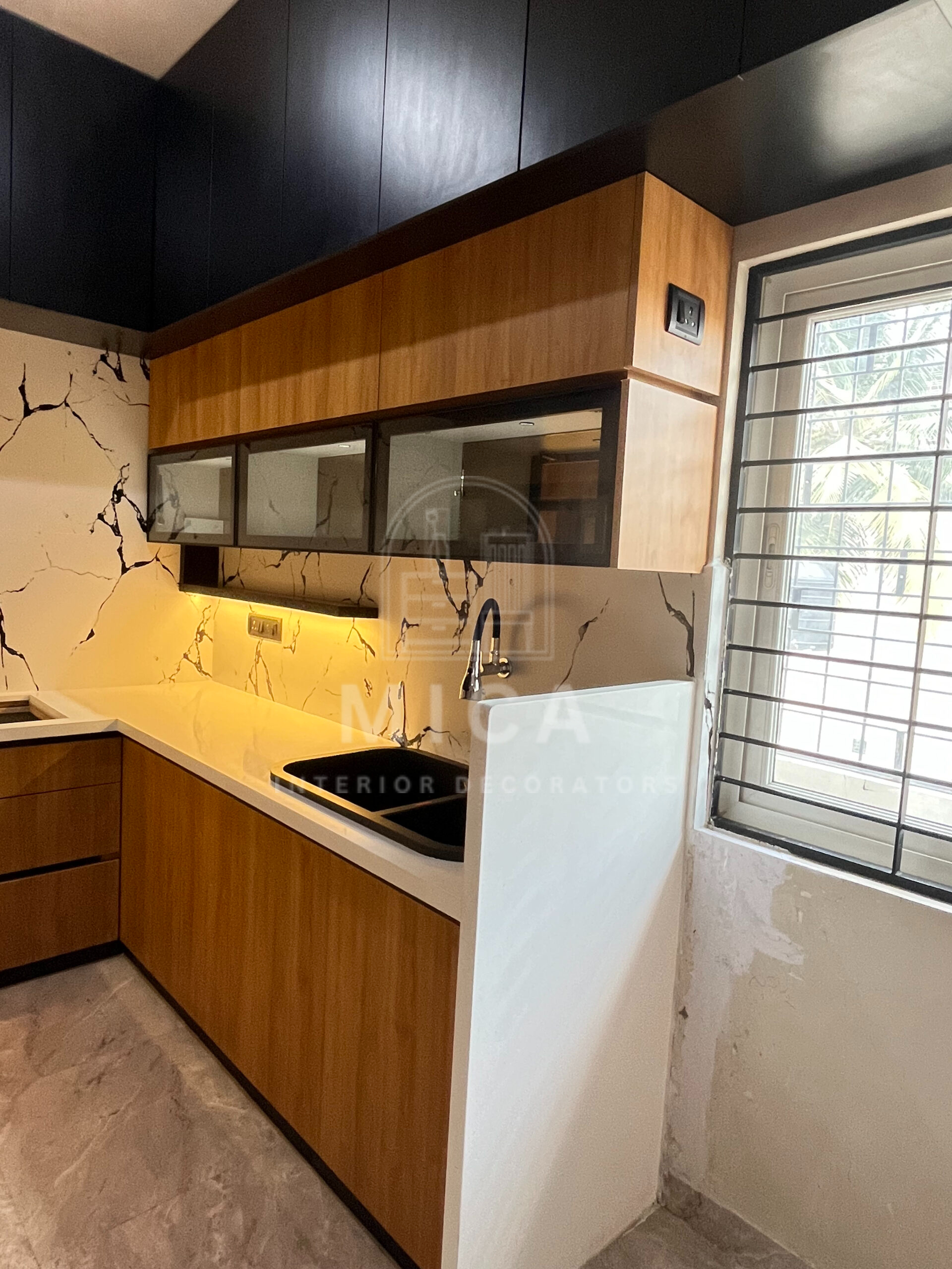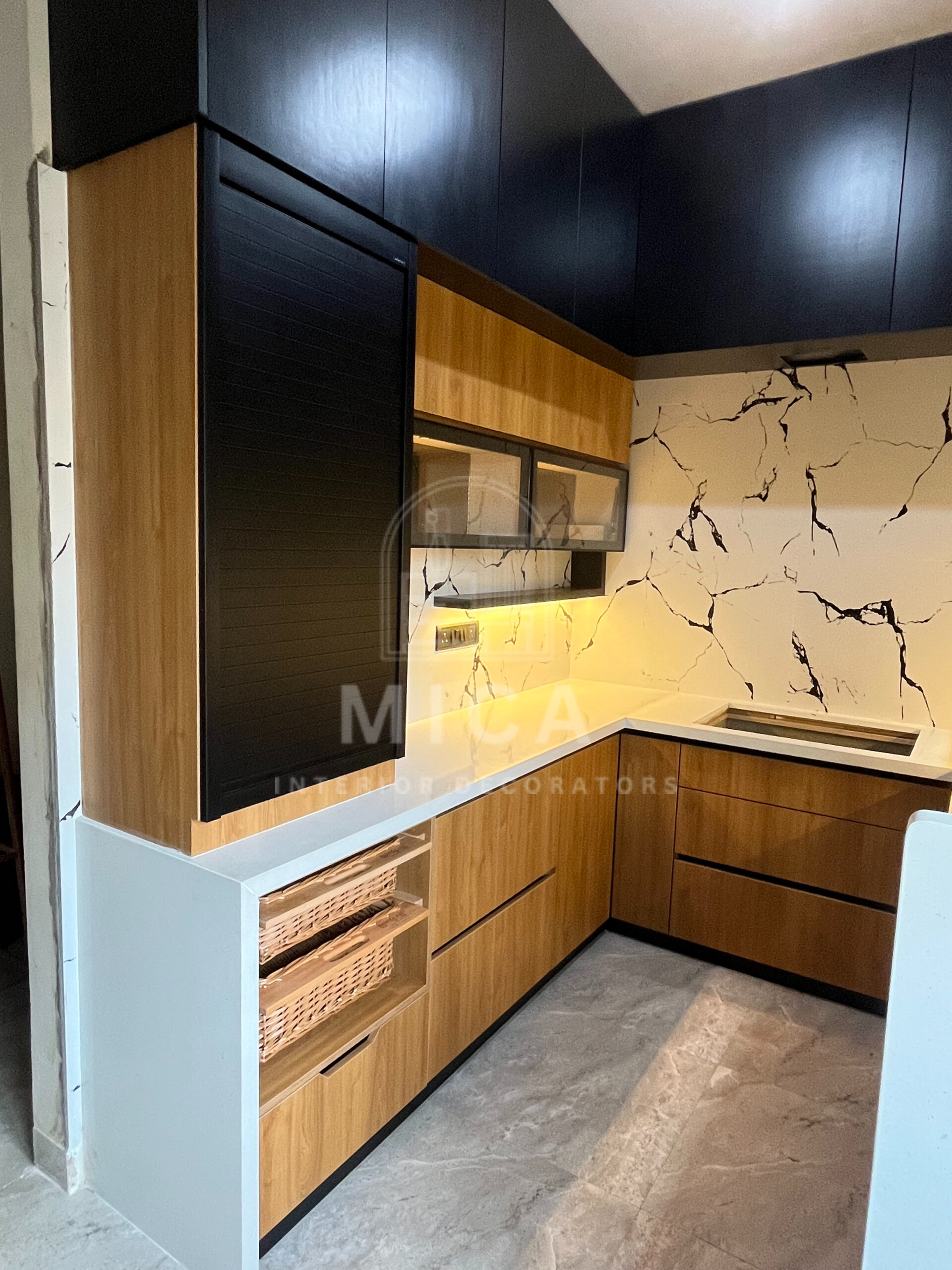 This interior design project by Mica Interior Decorators presents a sophisticated and modern approach to home interiors. The TV unit and display cabinetry feature a luxurious combination of black, wood, and glass with integrated warm LED lighting, creating an elegant ambiance. The modular kitchen boasts a sleek, contemporary design with a blend of wood and matte black finishes, complemented by a striking marble-patterned backsplash. Smart storage solutions, including pull-out baskets and glass-fronted cabinets, maximize functionality. The design focuses on rich textures, ambient lighting, and high-end materials, resulting in a refined and visually cohesive living space.