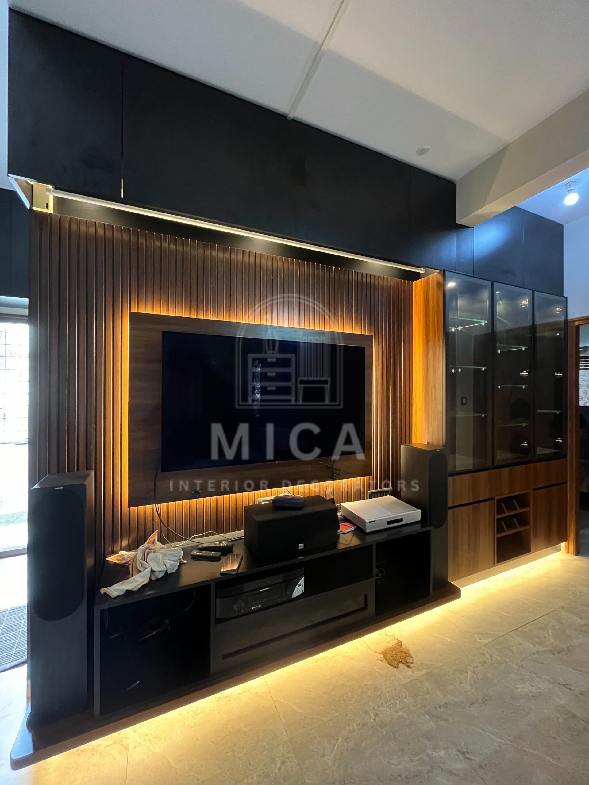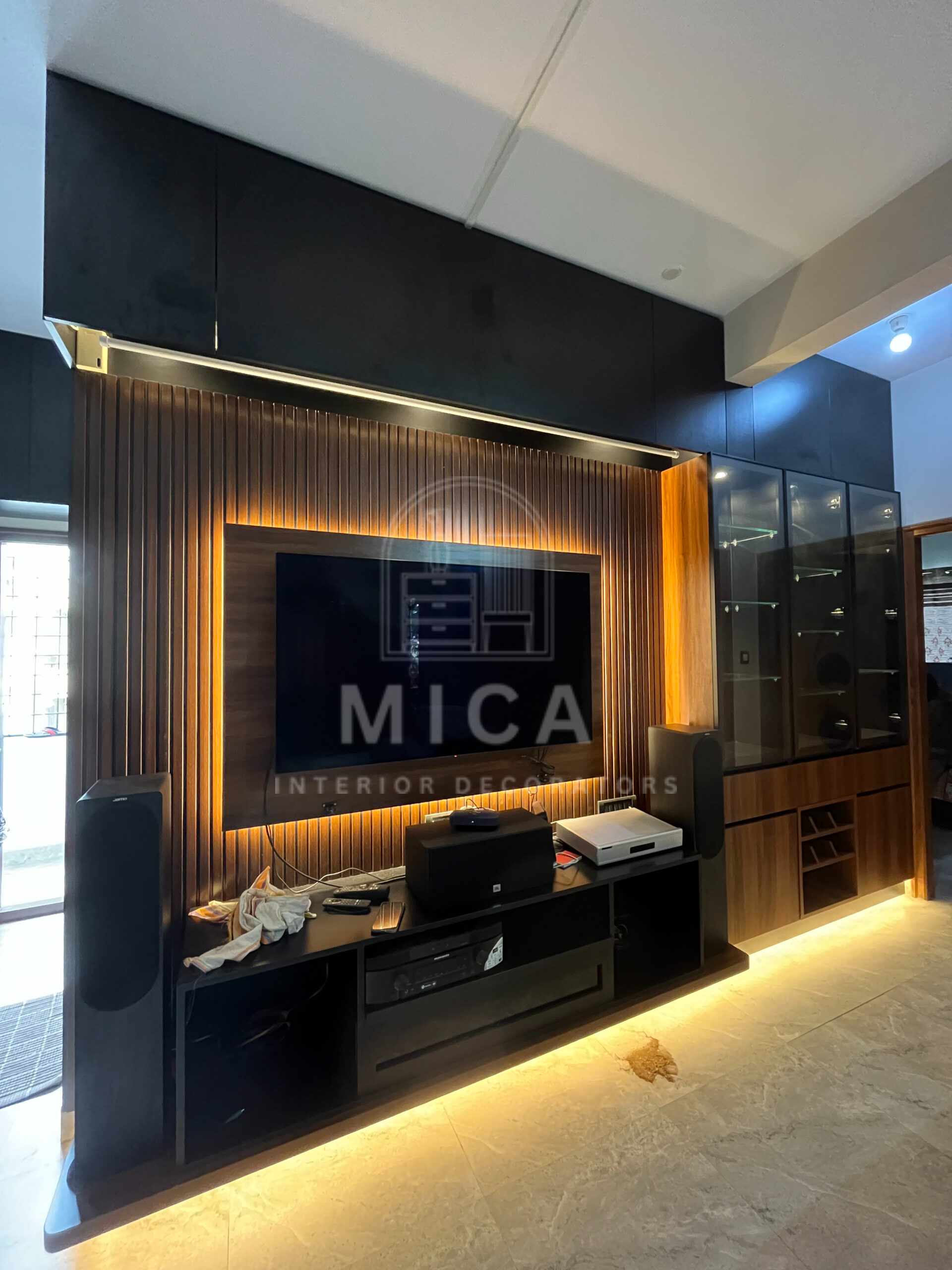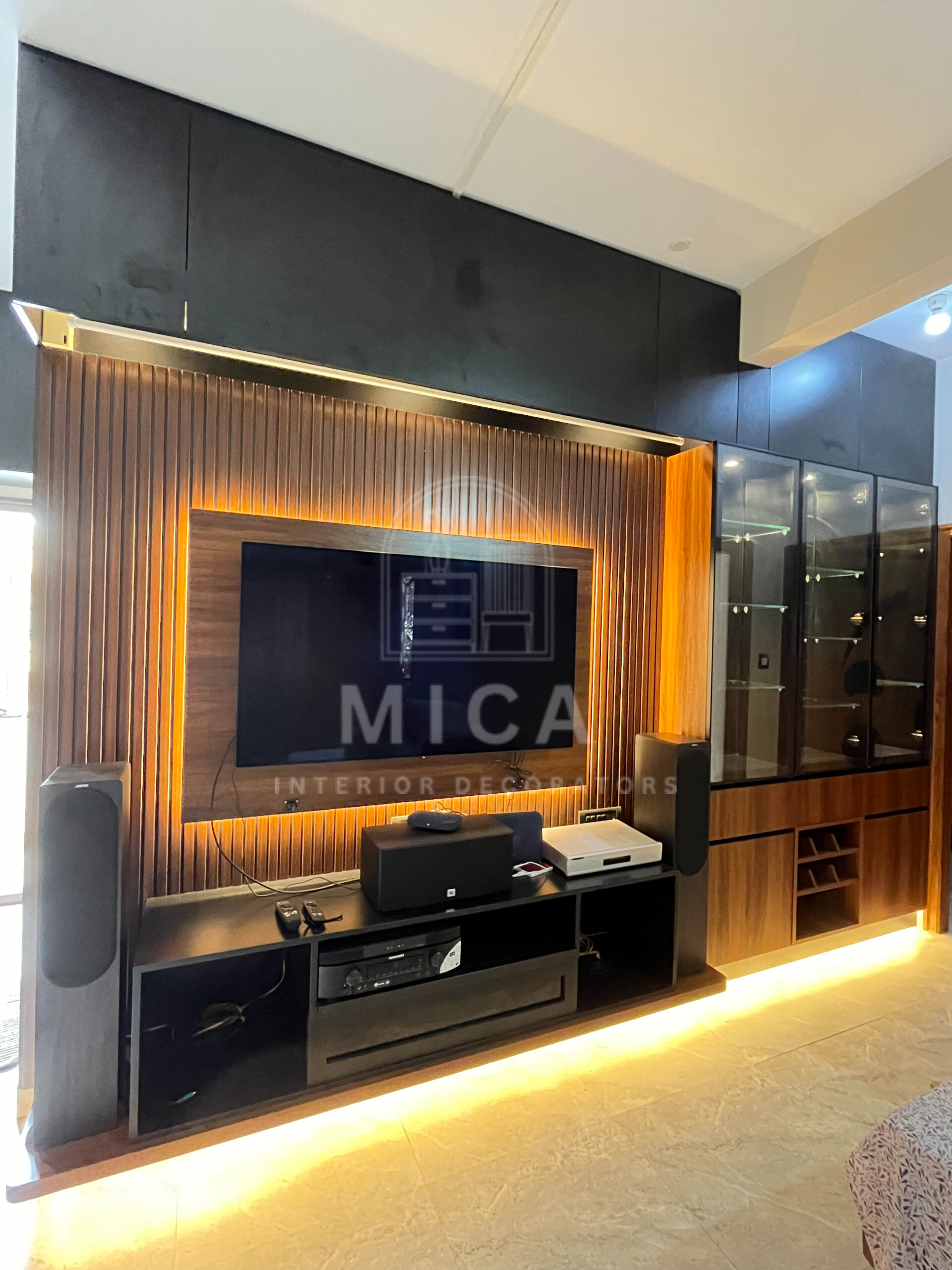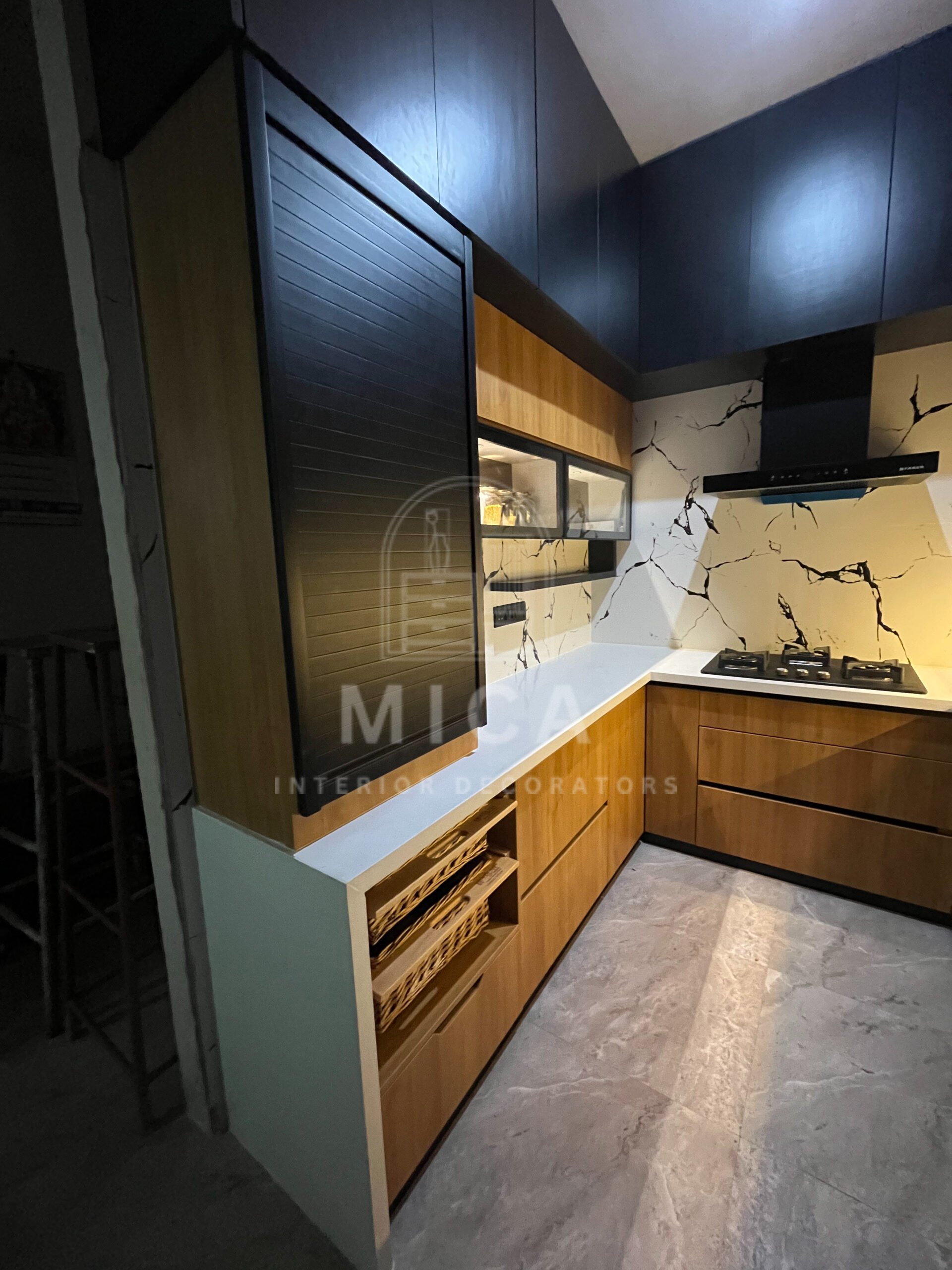 This interior design project by Mica Interior Decorators presents a sophisticated and modern approach to home interiors. The TV unit and display cabinetry feature a luxurious combination of black, wood, and glass with integrated warm LED lighting, creating an elegant ambiance. The modular kitchen boasts a sleek, contemporary design with a blend of wood and matte black finishes, complemented by a striking marble-patterned backsplash. Smart storage solutions, including pull-out baskets and glass-fronted cabinets, maximize functionality. The design focuses on rich textures, ambient lighting, and high-end materials, resulting in a refined and visually cohesive living space.