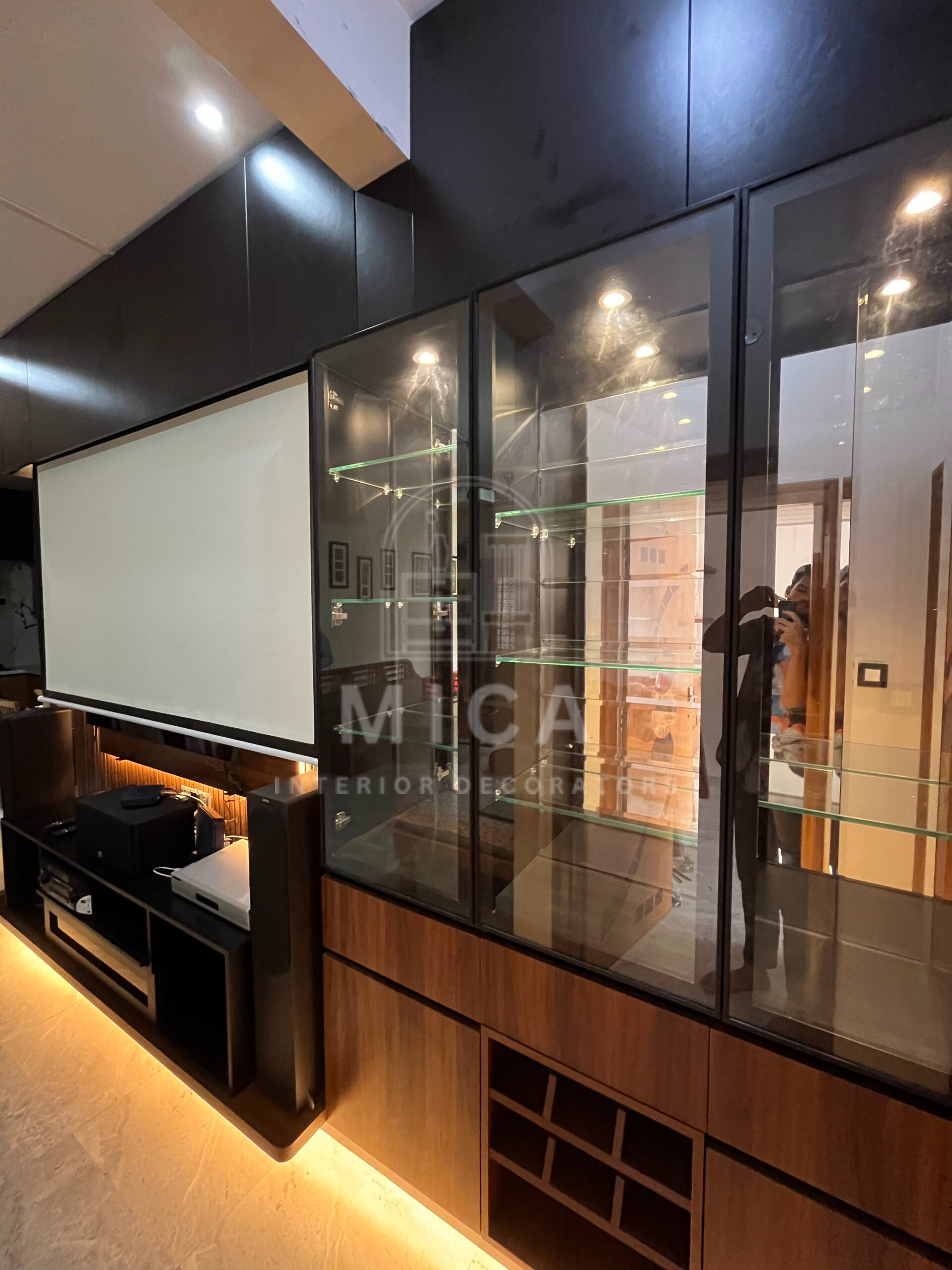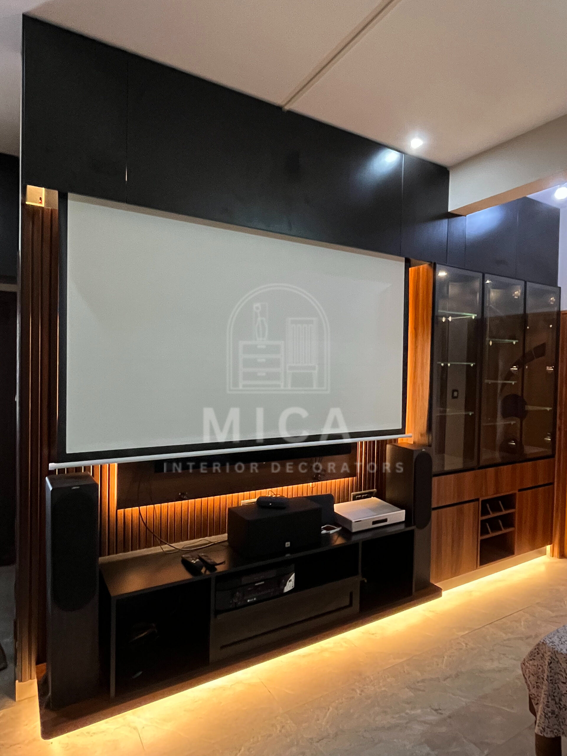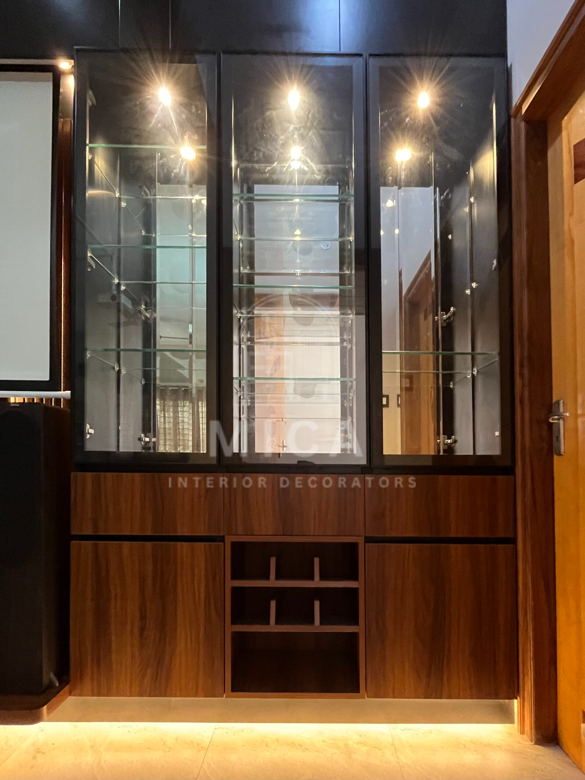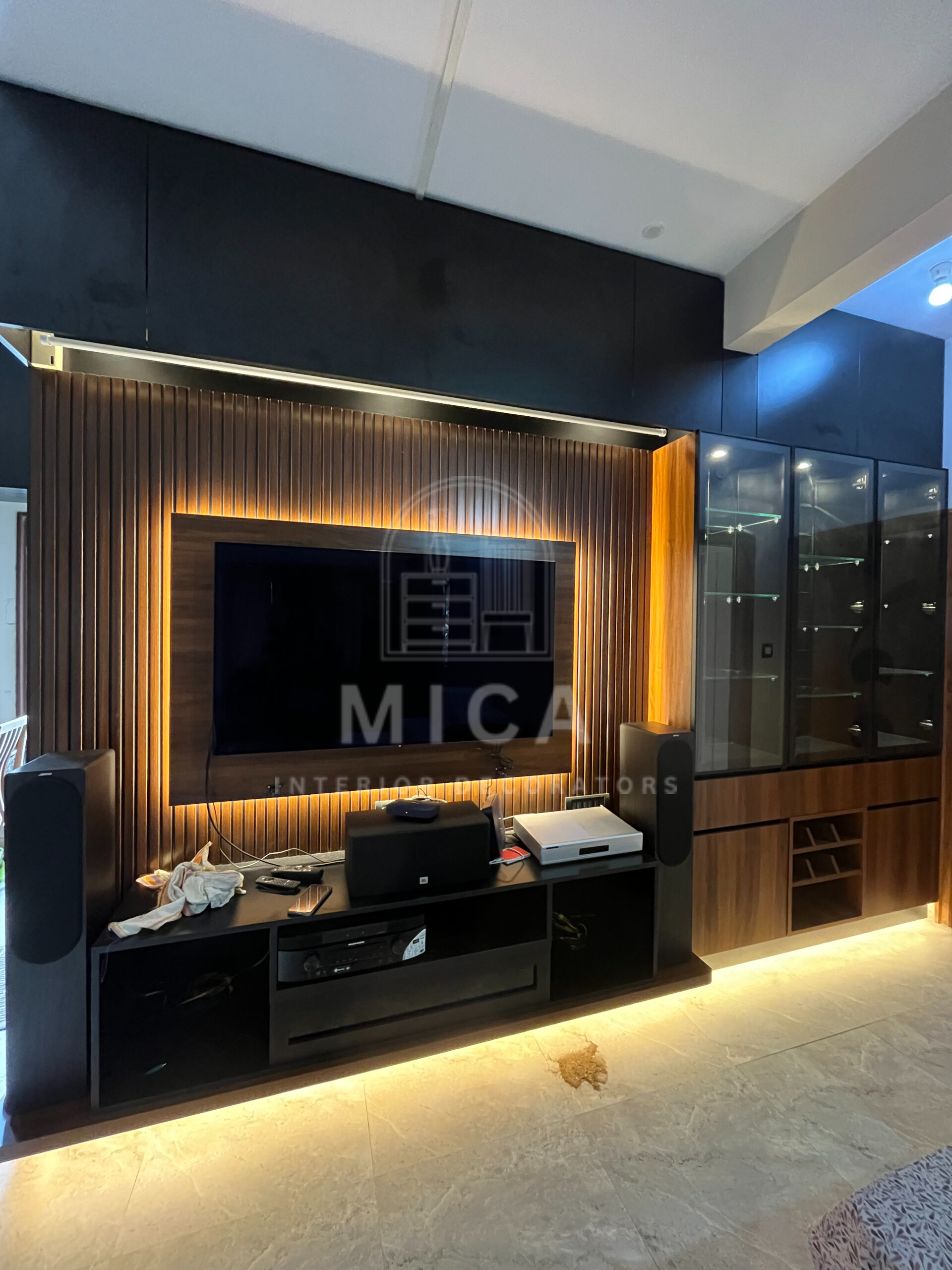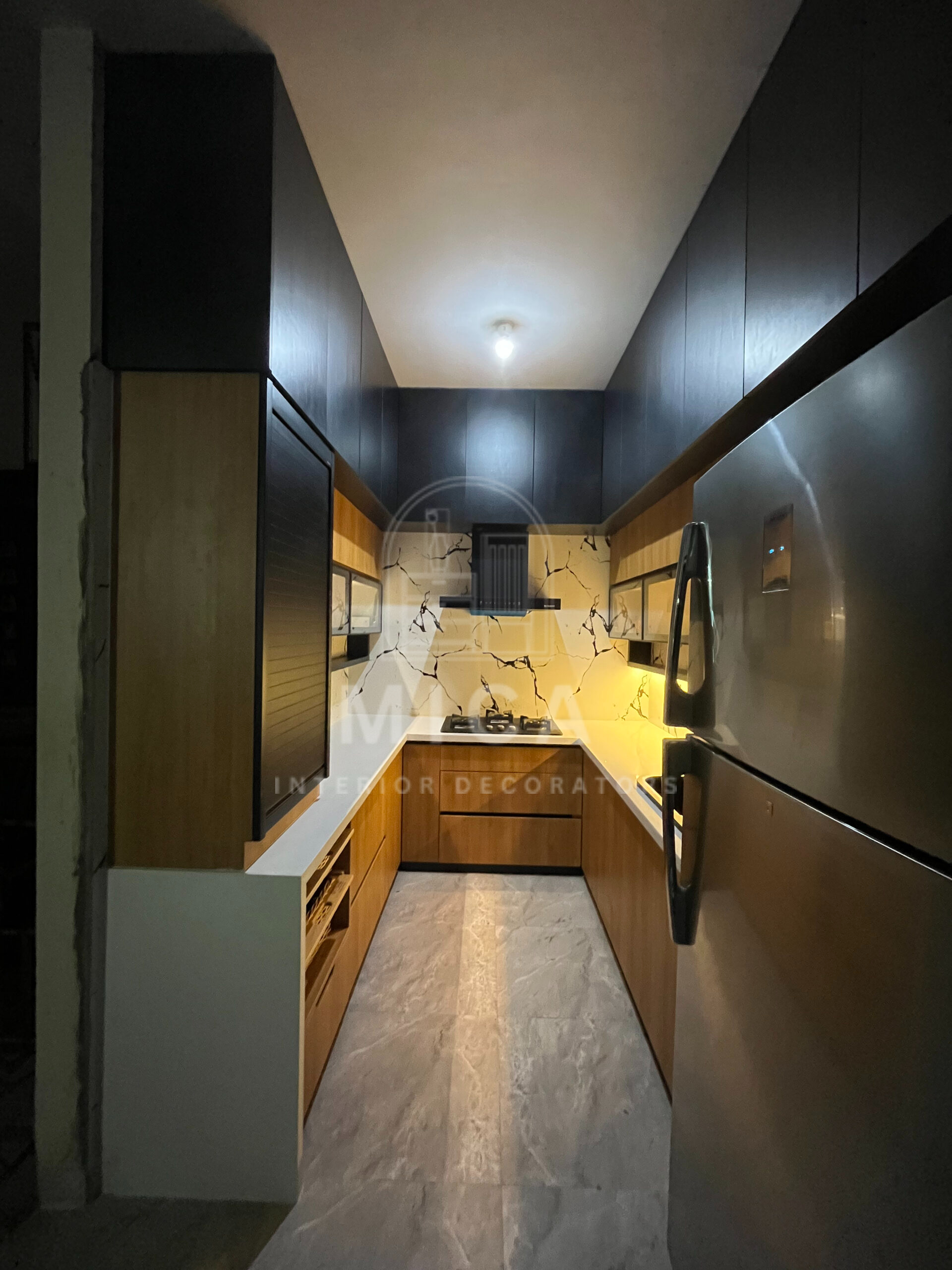 This interior design project by Mica Interior Decorators presents a sophisticated and modern approach to home interiors. The TV unit and display cabinetry feature a luxurious combination of black, wood, and glass with integrated warm LED lighting, creating an elegant ambiance. The modular kitchen boasts a sleek, contemporary design with a blend of wood and matte black finishes, complemented by a striking marble-patterned backsplash. Smart storage solutions, including pull-out baskets and glass-fronted cabinets, maximize functionality. The design focuses on rich textures, ambient lighting, and high-end materials, resulting in a refined and visually cohesive living space.